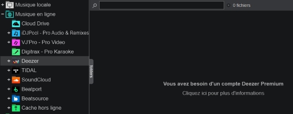 - Dans l’interface de Virtual DJ, repérez le panneau de navigation situé à gauche. Faites défiler jusqu'à la section Musique en ligne et sélectionnez Deezer.