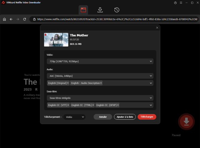 Vous pouvez maintenant cliquer sur "Télécharger" pour commencer le téléchargement, ou sur "Ajouter à la liste" pour télécharger plus tard. ViWizard téléchargera automatiquement tous les épisodes ou certains d'entre eux pour les séries télévisées, ainsi que les films entiers. Attendez que les téléchargements soient terminés ; ils seront enregistrés sous forme de fichiers MP4 ou MKV dans le dossier par défaut de votre ordinateur. Pour localiser votre contenu téléchargé, cliquez sur le bouton "Converti" en haut de l'interface principale de ViWizard. Si vous ne trouvez pas le dossier, cliquez sur l'icône "Dossier" à côté de chaque titre pour les localiser individuellement.